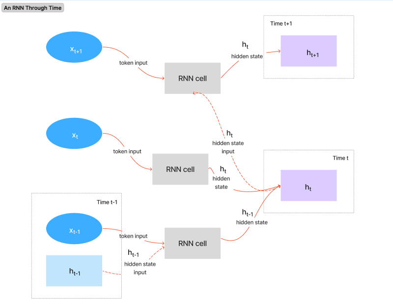 Figure 1. An RNN through time. The RNN cell processes input and the hidden state from time t-1 to produce the hidden state that is used as input together with token input from time t.