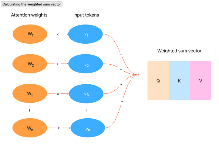 Figure 2. Calculating the weighted sum vector. Attention scores are multiplied by the Value (input) vectors which are then summed to produce the weighted sum vector.