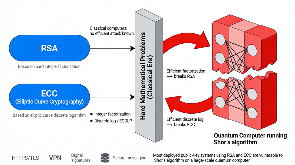The mathematical foundations of RSA and ECC encryption are vulnerable to quantum computers, which can efficiently solve them through Shor’s algorithm unless reinforced by quantum cryptographic standards. Notably, Shor’s algorithm is capable of factoring large numbers exponentially faster than the best-known classical techniques, thereby threatening the security of most existing public-key cryptography once sufficiently advanced quantum hardware becomes available.