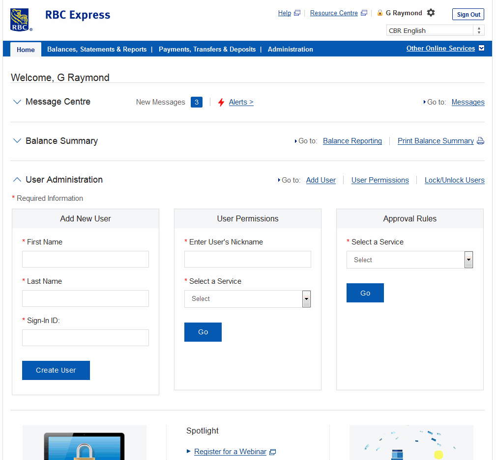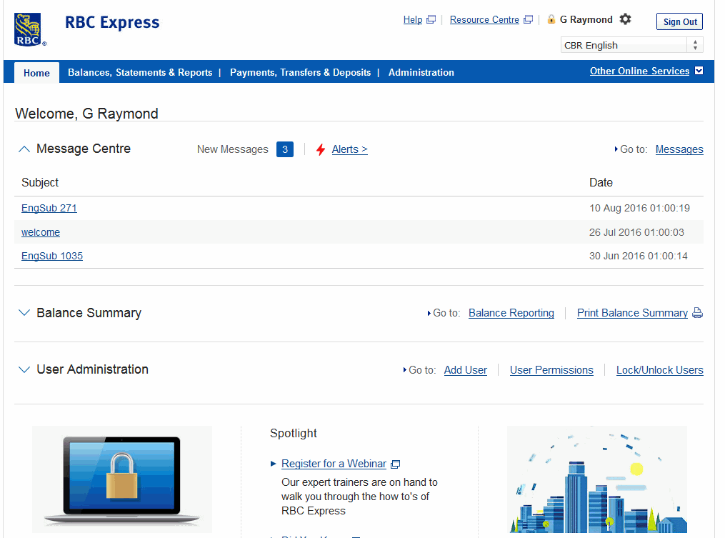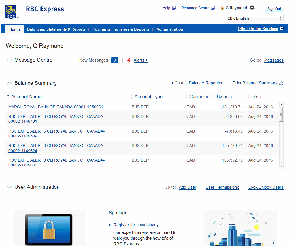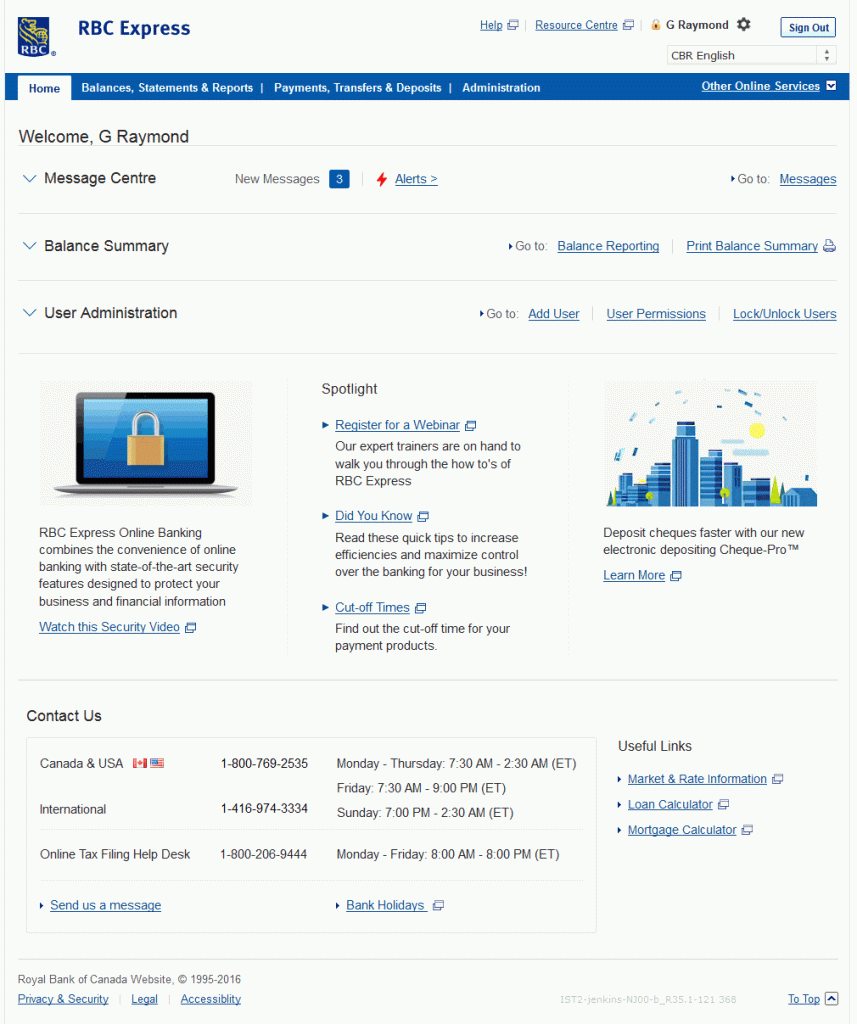 Prior to redesign, the RBC Express dashboard presented users with: